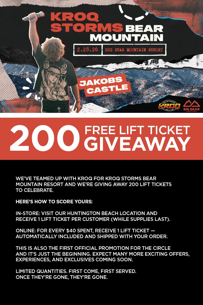 We’ve teamed up with KROQ for KROQ STORMS Bear Mountain Resort and we’re giving away 200 lift tickets to celebrate.Here’s how to score yours:In-Store: Visit our Huntington Beach location and receive 1 lift ticket per customer (while supplies last).Online: For every $40 spent, receive 1 lift ticket — automatically included and shipped with your order.This is also the first official promotion for THE CIRCLE and it’s just the beginning. Expect many more exciting offers, experiences, and exclusives coming soon.Limited quantities. First come, first served. Once they’re gone, they’re gone.